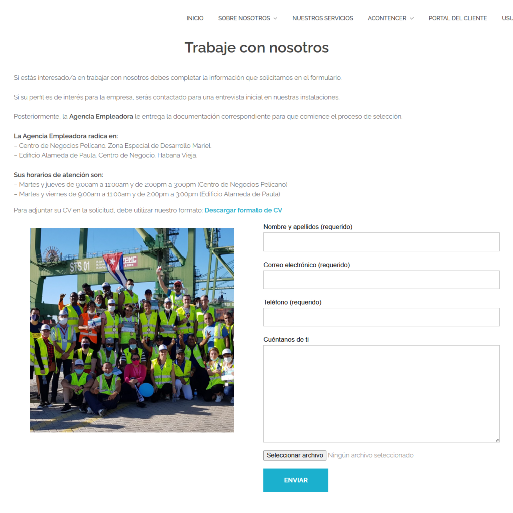 Otra de las nuevas experiencias que ofrece nuestro Sitio Web es brindarles la posibilidad a los usuarios, interesados en su contratación en la empresa, de enviar sus datos a través del apartado “Trabaje con Nosotros”, al que se pueden acceder desde el pie de página. Desde allí, los interesados envían su curriculum, el cual llega directamente a nuestra Especialista en Recursos Humanos, Licenciada en Psicología, Yenny González Figueredo, y encargada de la selección en la entidad, quien al respecto refiere: “Con esta nueva facilidad logramos un mayor alcance al público y se viabiliza el tema de la selección del personal al hacerse más directa y cercana la información ofrecida”.